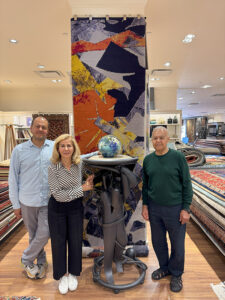 From left are Hadi Sattari and his parents, Jila Kalantari and Reza Sattari, owners of the Oriental Rug Mart, with one of Albert Paley’s sculptures and the rug interpretation behind them. On the sculpture is a glass sculpture by Josh Simpson.