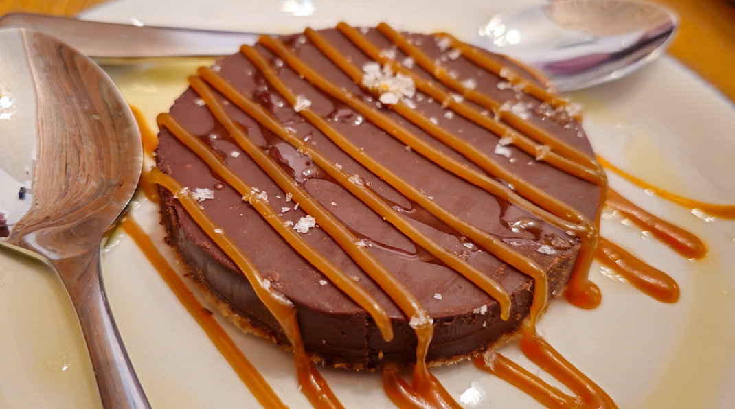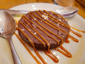 Desserts (all $8) are made in-house at the Rochester restaurant. There were only three options — French lemon custard, tiramisu and the chocolate tart we ultimately ordered — but I’d much rather have a few great options than many mediocre options. The chocolate tart, made with rich chocolate ganache on a toasted nut crust, finished with butterscotch caramel, was livened with a drizzle of bright, grassy extra virgin olive oil and a sprinkling of flaky sea salt.