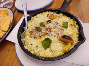 Pizzas range from $16 to $20 for a 12-inch pie that’s easily big enough to split, especially if you add a starter like the spinach artichoke dip ($14), a thick, decadent dip served in a sizzling cast iron skillet and studded with enough whole cloves of confit garlic (garlic slowly cooked in olive oil until soft, sweet and mellow) to make even the strongest vampire squirm. Topped with grated parmesan cheese and fresh basil, it’s easily one of the best versions of spinach artichoke dip you’ll find anywhere. It’s served with a bowl of store-bought tortilla chips, which served their role as vehicles to scoop the dip, but brought little else to the table.