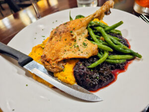 Duck confit, served with sweet potato puree, sauteed green beans and a cranberry-balsamic reduction.