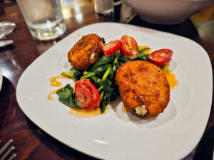 Fromage de chevre frit, or fried goat cheese fritters with sauteed spinach, shallot and tomatoes, topped with a spicy honey glaze.