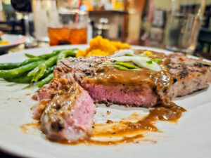 While the steak was grilled to my ideal doneness of just shy of medium-rare, I was disappointed that it lacked the peppercorn crust that gives the dish its name (au poivre translates to “with pepper”). That’s not to say the steak wasn’t seasoned. The simple salt and pepper would have been perfect for a classic steak and one could argue that au poivre’s characteristic peppercorn crust is overkill, but that’s what makes it au poivre.