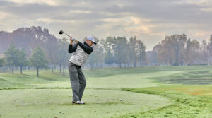 Golfer on a golf course in winter with fog and frost, on the starting tee. Golfer with golf club hitting the ball for the perfect shot. Le Robinie Golf Club