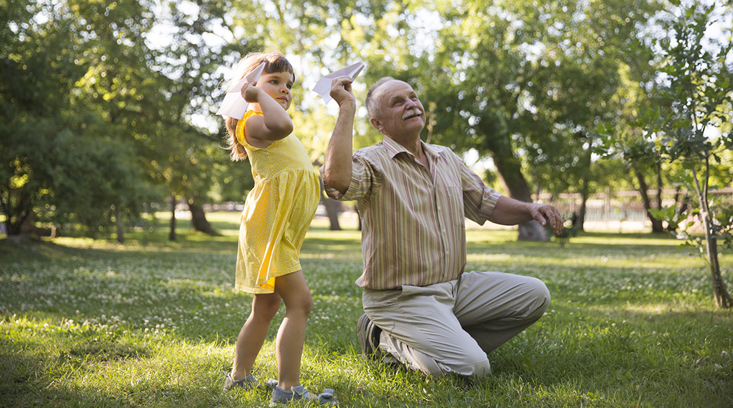 grandfather and child fly paper airplanes and have fun together in the park. Summer holiday grandfather and child fly paper airplanes and have fun together in the park. Summer holiday