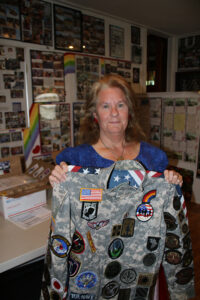 Mama Cindy and her camouflage jacket, with patches from the many units she’s adopted in her 20 years of comfort-giving to American soldiers overseas.