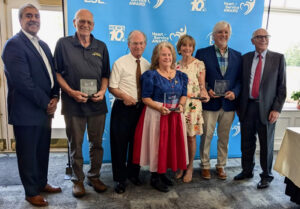 Award winners at the ESL/WHEC Channel 10 “HEART OF SERVICE luncheon on June 10. From left are ESL CEO Faheem Masood; Martin Parzynski of Bella’s Bombas; educator Devid Beck; Cynthia “Mama Cindy” Strasburg; educator Barbara Densmore; lacrosse coach Arthur Alvut; and WHEC President Dick Reingold.