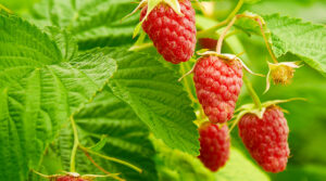 Several ripe red raspberries growing