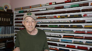 Steve DeMay in his train room