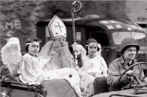 On Dec. 6, a parade wound through town, featuring Dick Brookins as St. Nicholas riding in a Jeep. He had a white beard attached, a mitre on his head, a vestment and cape and a staff. Two angels flanked him in the back seat.